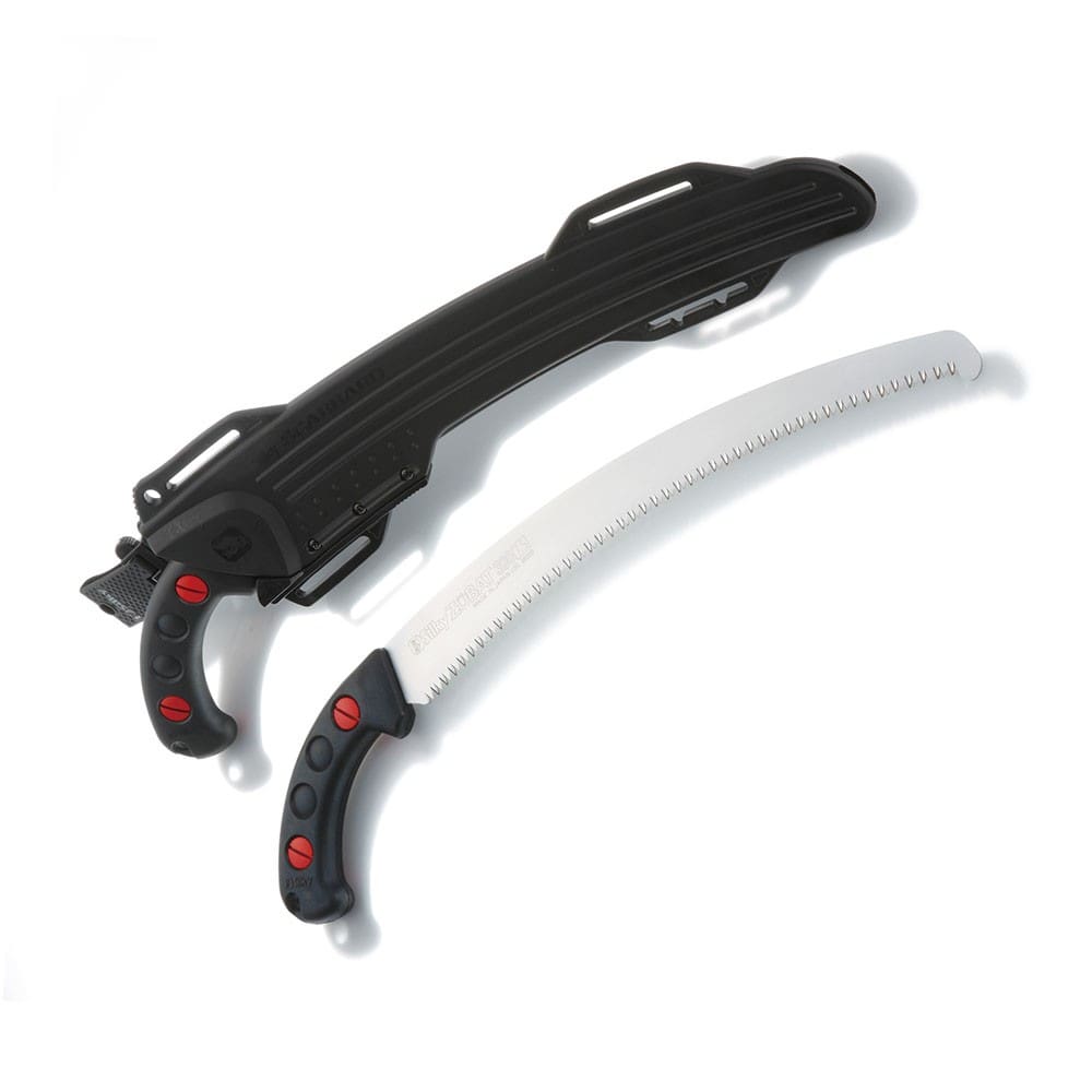 TheΒ SILKY ZUBAT LARGE TEETH saw is Silky's best-selling professional, heavy-duty, curved-blade hand saw and is suitable for all pruning tasks and for cutting large branches. A soft, molded-rubber handle holds the high-performance curved fast-cutting blade that fits securely inside its custom fitted scabbard with detachable belt holder. The curved blade means greater cutting speed with less effort. The hard chrome plated blade resists rust and the effects of tree resin and wipes clean easily.